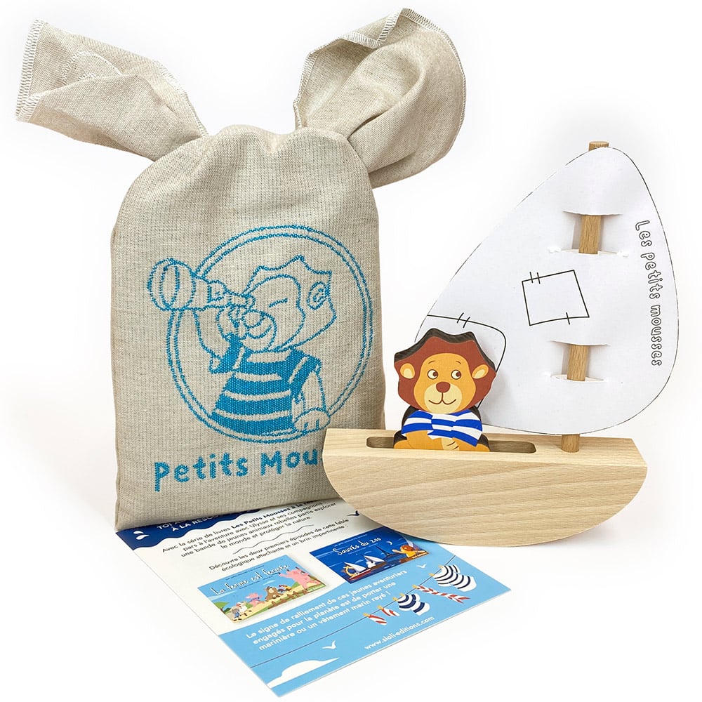 Ulysse le lionceau et son bateau à voile tirot sont deux adorables jouets éducatifs en bois qui jouent un rôle important au sein de notre série de livres “Les Petits Mousses à la rescousse de la planète”. En effet, l’histoire des Petits Mousses raconte l’épopée fantastique d’animaux venant des 4 coins de notre planète, d’abord tous occupants d’un même zoo et qui choisissent de le fuir pour découvrir la richesse de notre monde mais aussi prendre part à sa protection. Leur seul moyen de locomotion n’est autre que de modestes et jolis bateaux à voile de style tirot, comme celui d’Ulysse. Ensemble, ils se forgent une belle équipe d’aventuriers des mers, au sein de laquelle chaque animal a le souhait de naviguer vers sa terre d’origine. Ulysse le lionceau est le personnage à l’origine du projet ambitieux des petits mousses à la rescousse, équipé de son bateau à voile en bois qu’il surnomme Tornado, comme le cheval de son héros. Ulysse guide les autres animaux de la troupe et leurs bateaux respectifs à la découverte du monde. Le joyeux équipage vogue ainsi d’eaux douces en nappes profondes, dans l’unique but de protéger la planète en danger et combattre les vilains pirates qui polluent les mers.