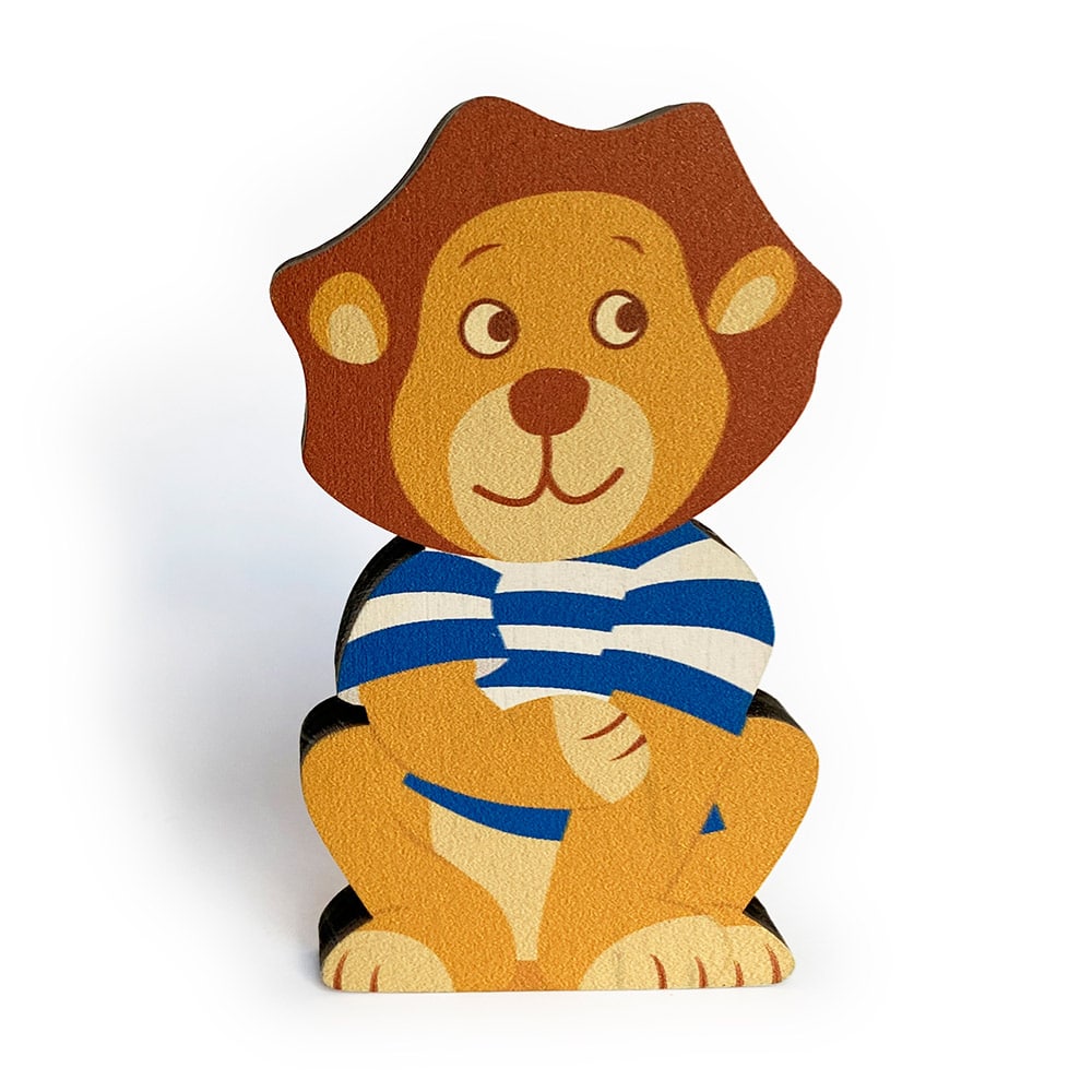 Pour développer les compétences visuo-spatiales des enfants, le personnage en bois Ulysse le lionceau est illustré sur chaque face, afin de permettre à l’enfant de se représenter l’animal de face et de dos. Les couleurs du personnage sont à la fois vives, joyeuses et élégantes : ocre, rouge brun et jaune.