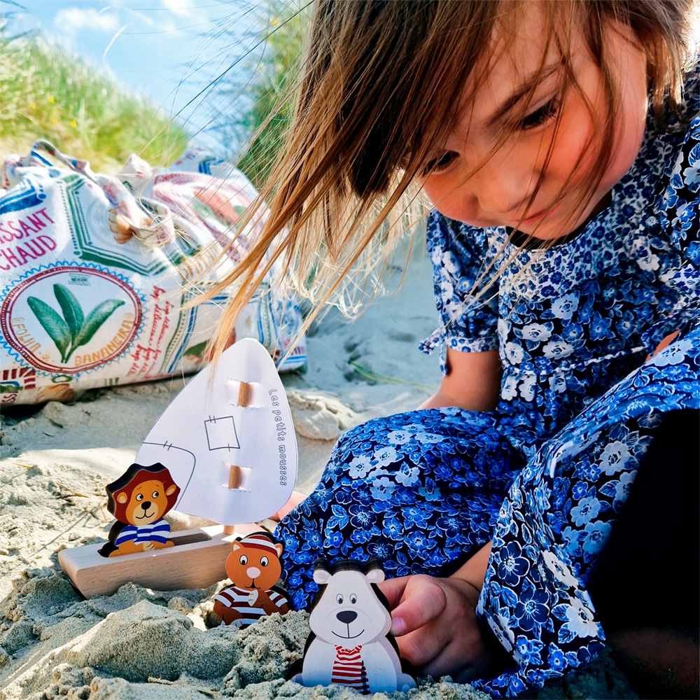 La voile du bateau en bois, d’abord neuve et vierge d’aventures peut être personnalisée par les joueurs, au fur et à mesure de leurs escales à travers le monde et leur imagination. Parmi les idées de customisation : l’enfant peut dessiner une carte du monde pour aider le lionceau Ulysse à ne pas se perdre durant son épopée, l’enfant peut également illustrer les constellations qui guideront nos aventuriers, ou encore représenter des symboles ou des paysages fantastiques. Le modèle de cette voile en papier peut également être reproduit à l’infini, afin d’habiller le bateau en bois tirot selon les envies de l’enfant et les différentes haltes à travers les pays du monde. Habillé d’une marinière comme ses coéquipiers les Petits Mousses, votre enfant sera le commandant de bord de la flottille !