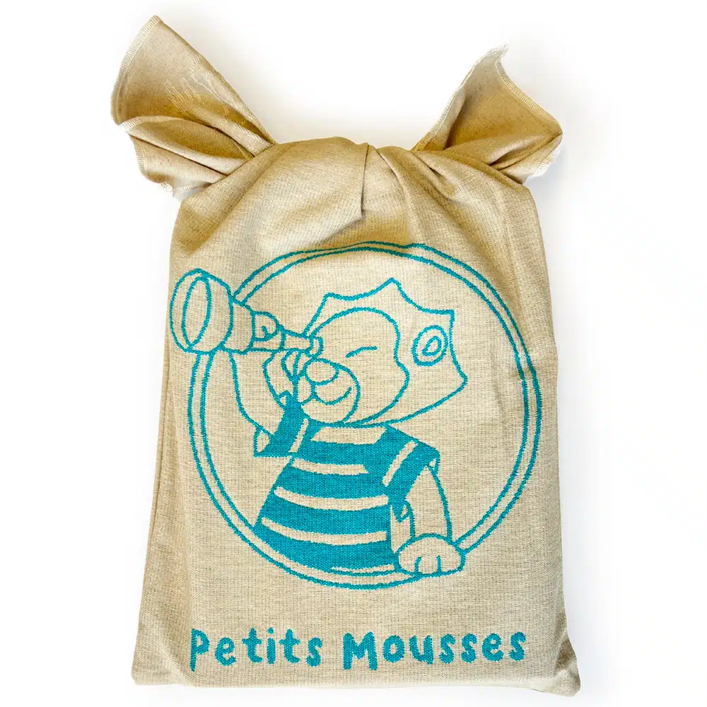 Les quatre tomes des aventures des petits mousses à la rescousse de la planète, rangés dans un superbe pochon en coton recyclé représentant Ulysse, le lionceau à l’origine de cette saga sur les océans.