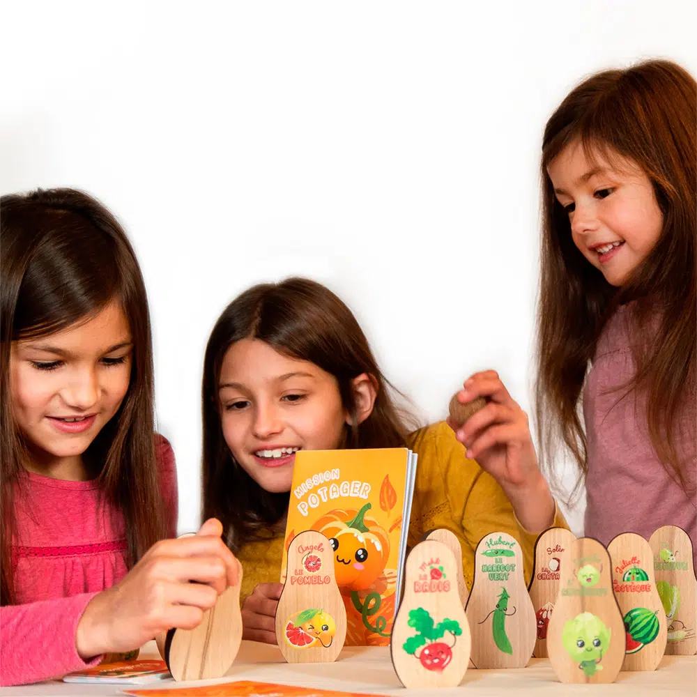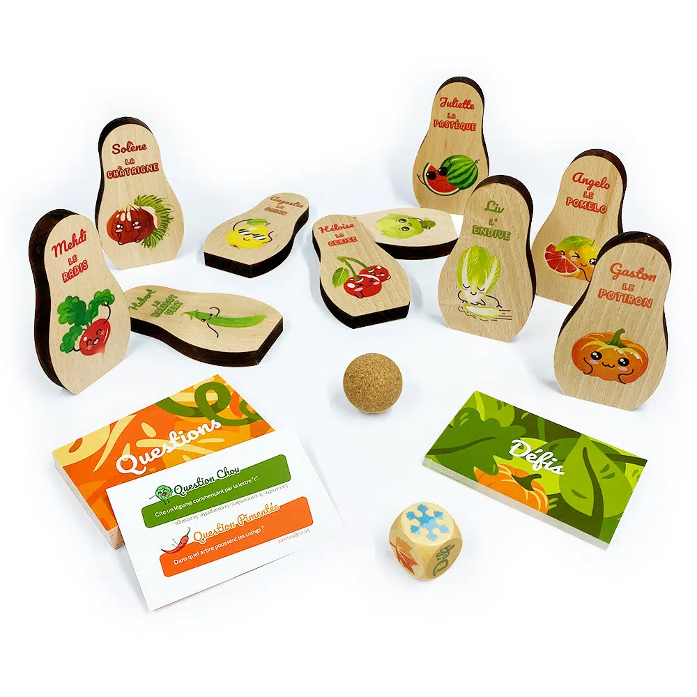 Comme tous les jouets et jeux de société que nous concevons chez Sloli, Mission Potager est un très beau jeu de quilles en bois massif du Jura, produit en France. Le design des différentes pièces de bois du jeu a été travaillé avec soin et offre un rendu très qualitatif qui charme les enfants comme les adultes ! Les couleurs sont douces et joyeuses, la forme des quilles est très élégante et épurée, les illustrations sont charmantes et malicieuses… Un enfant pourra s’attacher facilement à chaque fruit ou légume grâce à leur jolie frimousse et le prénom avec lequel nous les faisons rimer (Sancho l’Artichaut, Gaston le Potiron, Mehdi le Radis…) De quoi donner envie aux enfants de manger des fruits et légumes (de saison, bien sûr…) et de se mettre au jardinage !